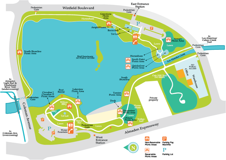 Nice that we're having the meeting in my neighborhood (well -- nice for ME anyways!). As such, let me give you a little help finding the place, for those unfamiliar with the area. From Hwy 85, take Almaden Expressway south about a mile; continue past Coleman Rd. and you'll see the park on your left. Make a U-turn at the next light (McAbee Rd./Winfield Bl.) and come back around to the west entrance and park in the parking lot. The Tamien Picnic site is nearby. See the park map, below. See you there.